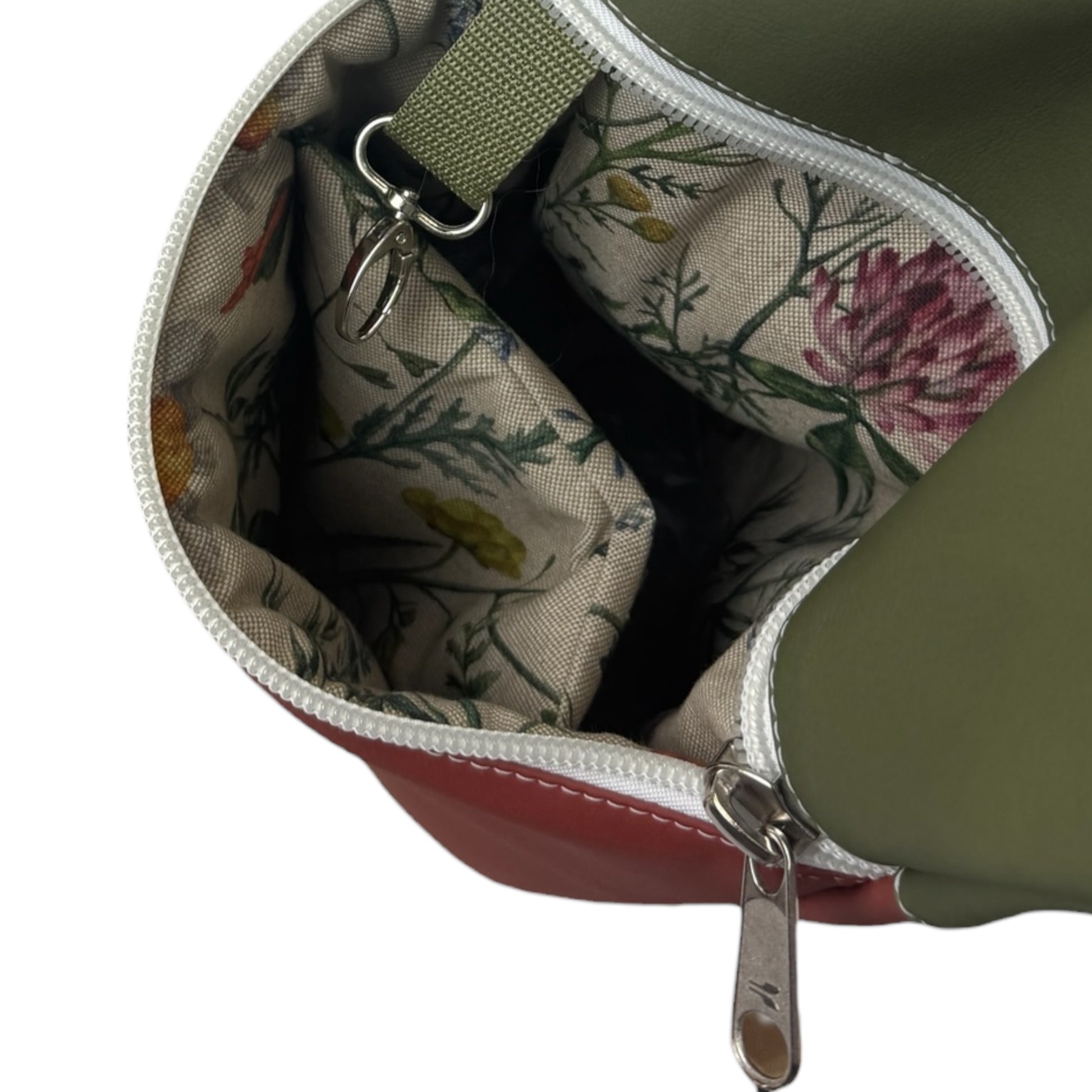 Die Größe des Rucksack läßt sich schwer in Litermaß beschreiben. Es passt aber Din A4 rein. Also ein Collegeblock oder ein 15Zoll Laptop. Gewichtsmäßig sage ich auf dem Markt immer: "Zwei PET Flaschen mit 1,5 Liter Inhalt passen rein. Das entspricht 3 Kg. und mehr sollte man auch nicht schleppen." Zusätzlich nähen wir innen immer eine kleine Tasche fürs Handy oder ein kleines Portemonnaie mit ein. Und einen Karabiner, wo Du gut Deine Schlüssel befestigen kannst.